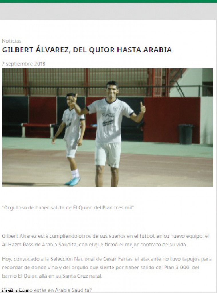 أوضح جيلبرت ألفاريز، مهاجم المنتخب البوليفي الأول لكرة القدم، أنه وقَّع على أفضل عقد في حياته بانضمامه إلى فريق الحزم السعودي، مشيرًا إلى أنه سعيد بخوض هذه التجربة الجديدة في حياته، وتمثيل منتخب بلاده أمام نظيره السعودي. المهاجم تحدث للفريق الإعلامي لاتحاد كرة القدم البوليفي عن رحلته إلى السعودية، وانطباعه الأول عن البلد، والكرة السعودية.