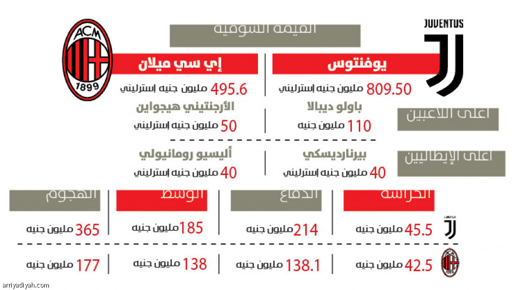 تبلغ القيمة السوقية للاعبي يوفنتوس وميلان، طرفي مباراة كأس السوبر الإيطالية بعد غد على ملعب مدينة الملك عبد الله الرياضية “الجوهرة المشعة” في جدة مليار جنيه إسترليني، أي ما يعادل 6.284 مليار ريال سعودي، حسب موقع “transfermarkt” العالمي المتخصص بإحصائيات وأرقام سوق انتقالات المحترفين. ويتفوق يوفنتوس على منافسه في القيمة السوقية، إذ بلغت 809.5 مليون جنيه “3.89 مليار ريال”، فيما قدر فريق ميلان بـ 495.6 مليون جنيه “2.38 مليار ريال”. ويأتي الأرجنتيني باولو ديبالا، مهاجم يوفنتوس كأغلى لاعبي الفريقين بـ 110 مليون جنيه “529.67 مليون ريال”، يليه البرتغالي كريستيانو رونالدو بـ 100 مليون جنيه “481.52 مليون ريال”، فيما يعد الأرجنتيني هيجواين أغلى لاعبي ميلان بقيمة سوقية بلغت 50 مليون جنيه إسترليني “240.76 مليون ريال”.