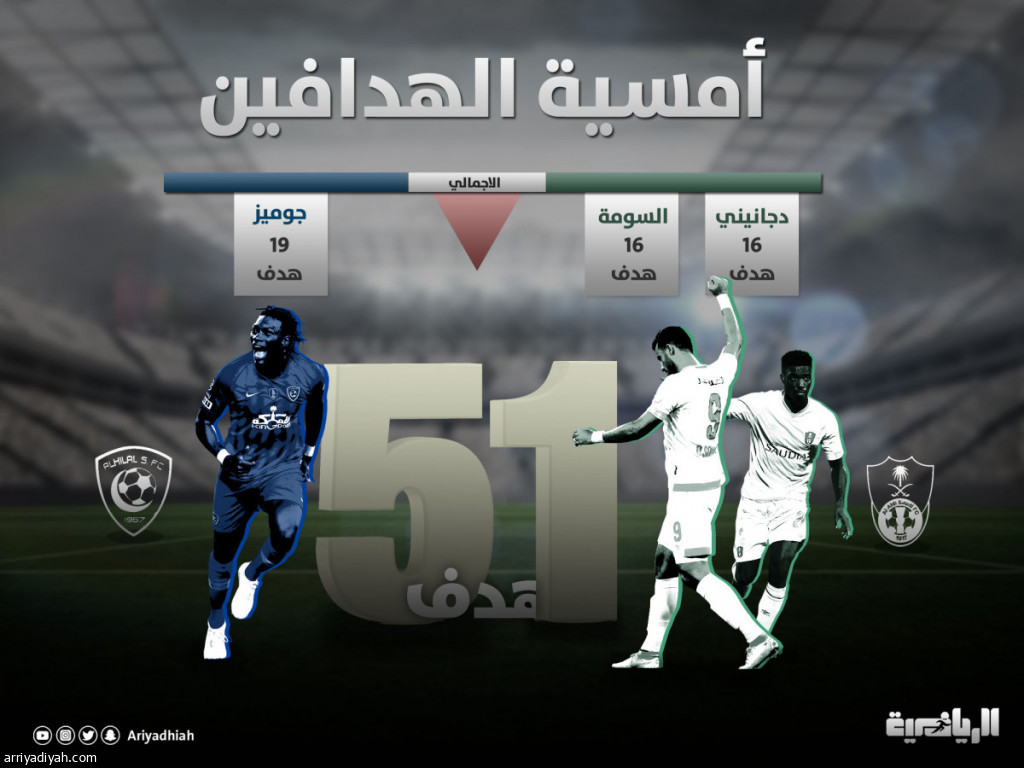 وبين هذه وتلك، فالتحدي الآخر الذي تظهر تفاصيله بين السطور، يجمع هداف الهلال بافيتيمبي جوميز صاحب الـ19 هدفاً، وثنائي الأهلي عمر السومة، ودجانيني تفاريس بـ32 هدفاً، وبواقع 16 لكل منهما، مايعني أن ميدان «الجوهرة المشعة» سيكون شاهداً على 51 هدفاً لثلاثة نجوم فقط تتسارع خطواتهم نحو الشباك، حاملون معهم راية أحلام العشاق هنا وهناك.