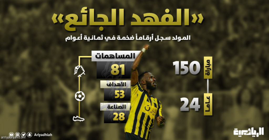 «الفهد» لعب مع الاتحاد منذ انطلاقته 150 مباراة في مختلف المسابقات، ساهم خلالها بـ81 هدفاً سجل منها 53، وصنع الـ28 الأخرى، كل ذلك وهو لم يجتز بعد الـ24 من عمره، وسيكون المولد أمام تحدٍ جديد هذه المرة، بمرافقة زملائه إلى المنصة ولكن متوجين بالذهب، إذ لم يشارك في المباراة النهائية الموسم الماضي لاربتاطه حينها بفترة احتراف خارجية مع ليفانتي الإسباني.