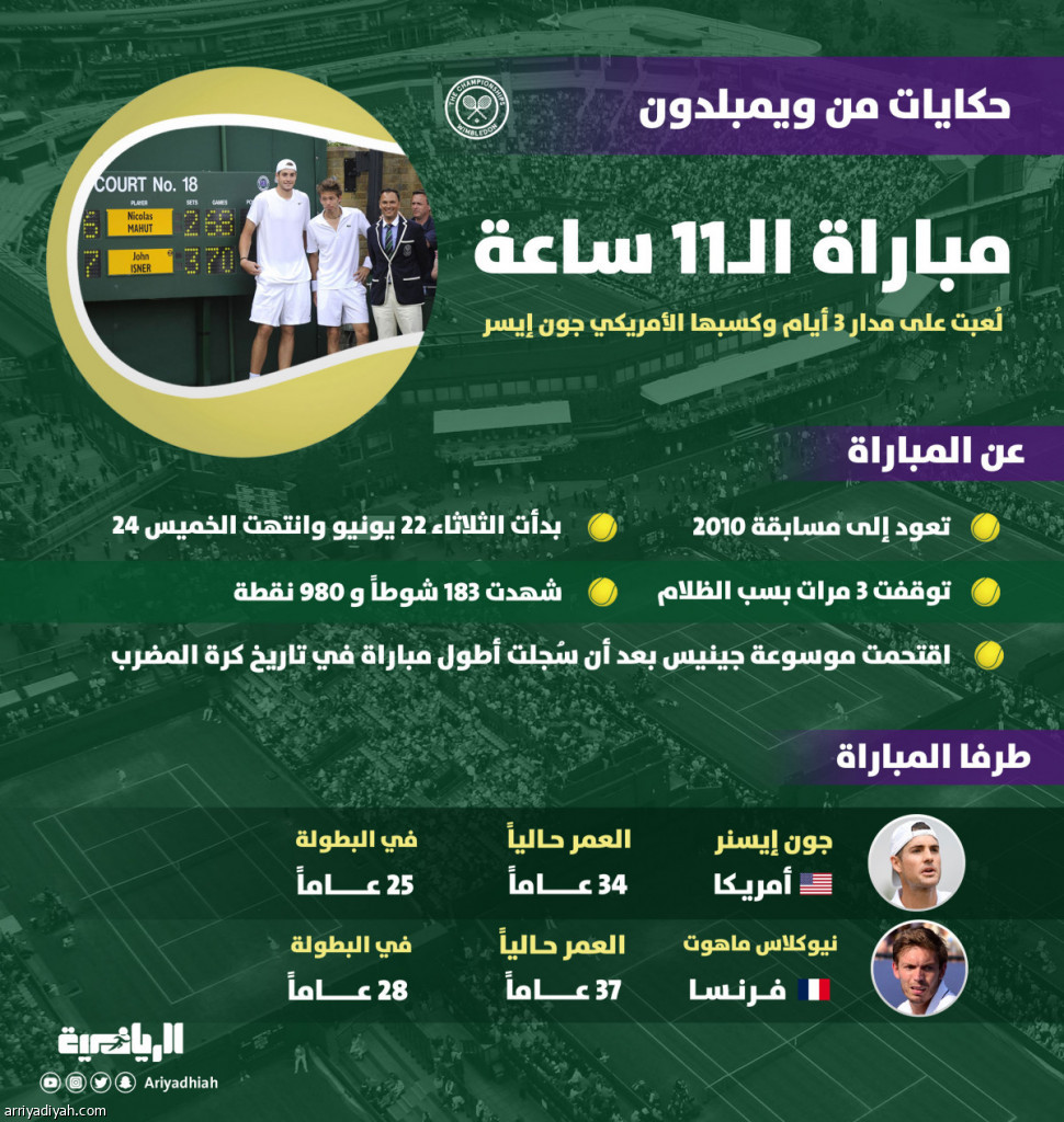 وبعد يوماً تلو الأخر، فاز اخيراً إيسنر بالمواجهة الملقبة بـ«مباراة اللانهاية» وذلك يوم الخميس الـ24 من يونيو وبعد أن استكملت المباراة في إجمالي أوقاتها 11 ساعة وخمس دقائق، وبالتأكيد باتت أطول مباراة في تاريخ كرة المضرب، واسجلت بين صفحات موسوعة جينيس للأرقام القياسية.