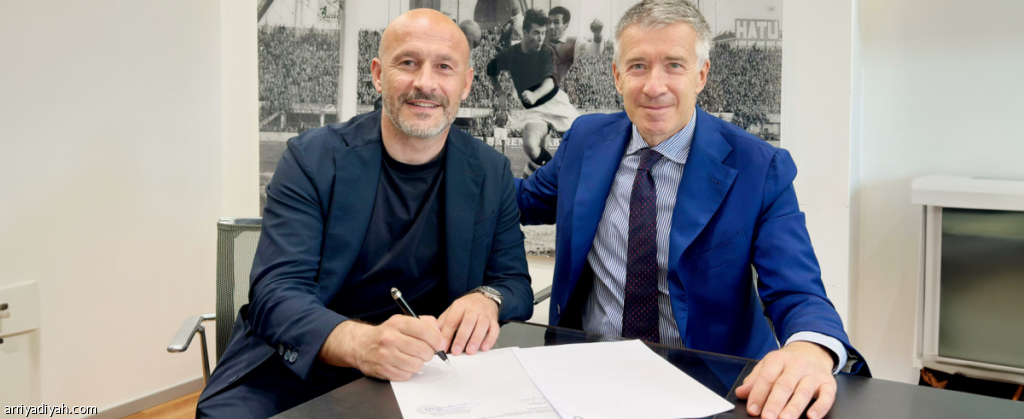كلاوديو فينيشي المدير العام لنادي بولونيا وفينتشنزو إيتاليانو بعد تجديد العقد، الخميس (المركز الإعلامي - بولونيا)