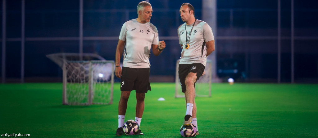 البرتغالي جوزيه جوميز، مدرب الفتح، يتحدث مع المصري أحمد مجدي، المدرب المساعد، خلال حصة تدريبية للفريق، الجمعة في الأحساء (المركز الإعلامي-- الفتح)