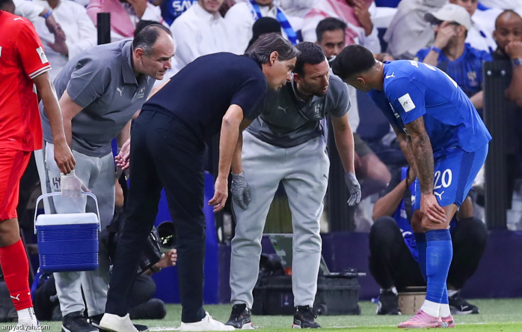 الإيطالي سيموني إنزاجي مدرب فريق الهلال الأول لكرة القدم يطمئن على إصابة البرتغالي جواو كانسيلو والتي شعر بها خلال مجريات مواجهة الدحيل تصوير: فهد المري
