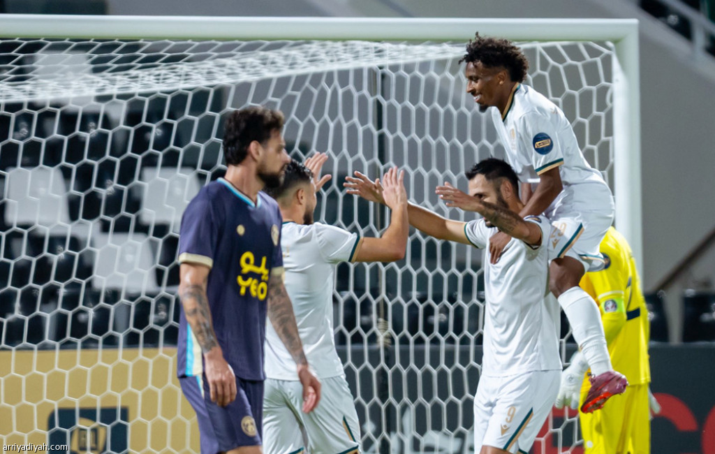 الفرنسي جايتان لابورد مهاجم فريق الدرعية يحتفل مع زملائه بعد تسجيله الهدف الثالث في مرمى العدالة، الأربعاء (المركز الإعلامي ـ دوري يلو)